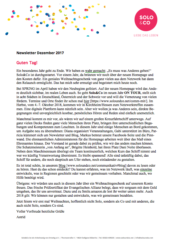 Bitte, macht mit und ladet zu unseren ON TOUR-Tagen ein! Detail-Informationen und Flyer zu jedem Ort findet ihr hier Solo&Co on Tour. Dort kann man sich auch anmelden, was unbedingt nötig ist. Gern schicken wir euch auch gedruckte Flyer zu. Meldet euch, wie viele ihr wohin braucht.